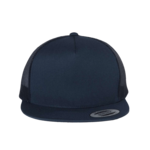 Yupoong Classic Truckers Cap. 47% Cotton/25% Polyester/28% Nylon. Trucker mesh back, white plastic snap. Hard buckram. Matching undervisor. High profile, 5 panel cap with 4 crown and flat visor.