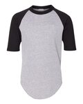 Augusta Youth 3/4 Sleeve Baseball Shirt. Upgraded fit with a modern cut for more active lifestyles! 50/50 cotton/poly jersey knit fabric. Contrasting 3/4 length raglan sleeves and collar, with serge fishtail bottom. Tear away label.