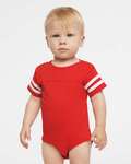 Rabbit Skins Infant Unisex Football Fine Jersey Bodysuit. 4.5 oz. 100% combed ringspun cotton (Vintage colors are 60/40). Cover stitch front and back yoke. Contrast stripes on sleeves. Double-needle hem sleeves and bottom. Taped neck with EasyTear label. Double-needle ribbed binding on leg opening. Innovative snap closure. CPSIA compliant tracking label in side seam. 100% combed ringspun (Vintage colors are 60/40). Side seam construction. Ships from Ball Ground, GA